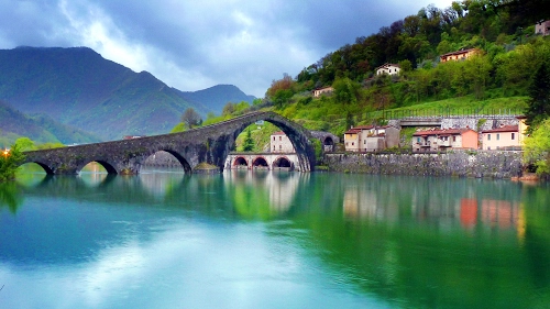 Tag: ponte, case, archi, fiume, verde, alberi, acqua, riflessi, montagne, cielo, nuvole, piante, toscana, azzurro, paese, paesaggio, borgo.