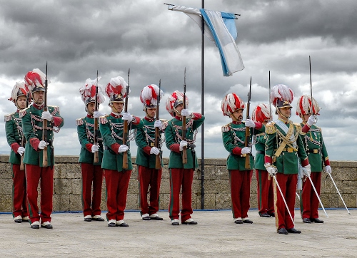 Altri tag (senza riscontro): pennacchi, sciabole, muretto, baionette, guardie, casco, celeste, giubba, asta, squadra.