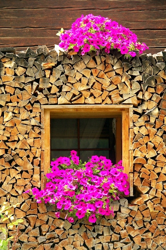 Tag: finestra, fiori, legna, catasta, legno, viola, piante, ciocchi, marrone, petunie, fucsia.
