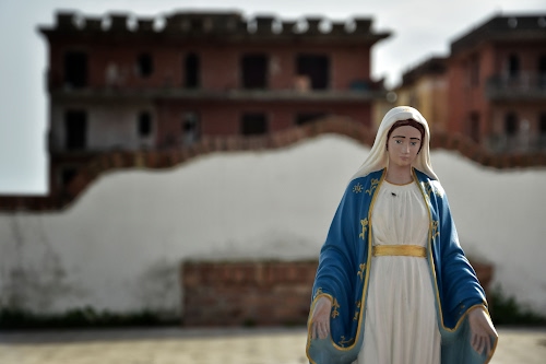 Tra le rovine, la Madonna sembra portare il peso della tristezza di un mondo abbandonato, in attesa di speranza e redenzione.