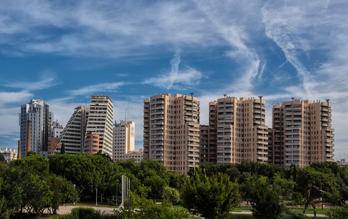 Tag: nuvole, grattacieli, cielo, alberi, palazzi, finestre, città, verde, parco, piante.