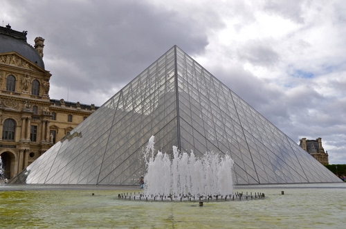 Tag: fontana, acqua, piramide, vetro, nuvole, cielo, geometrie, zampilli, parigi, palazzo.