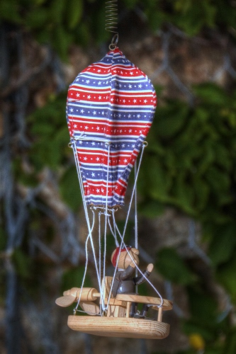 Tag: giocattolo, legno, mongolfiera, rosso, pupazzo, fili, molla, blu, colori, appeso, elica.
