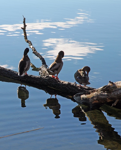 Tag: acqua, riflessi, anatre, ramo, tre, tronco, uccelli, rami, animali, legno, volatili, germani, azzurro, riflesso, papere.
