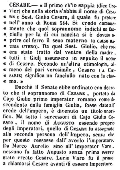 | Cesare - «Il primo ch'io sappia (dice Crevier) che nella storia s'abbia il nome di Cesare è Sest. Giulio Cesare, il quale fu pretore nell'anno di Roma 544. Si crede comunemente che quel soprannome indichi un fanciullo per la cui nascita si è dovuto aprire col ferro il seno materno (a caeso matris utero). Da quel Sest. Giulio, che così era stato tratto dal ventre della madre, tutti i Giulj assunsero in seguito il nome di Cesare. Secondo un'altra etimologia, almeno del pari verosimile, Cesare (a Caesarie) significa un fanciullo nato con la chioma.»