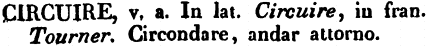 Circuire - v. a. In lat. Circuire, in fran. Tourner. Circondare, andar attorno. [immagine]