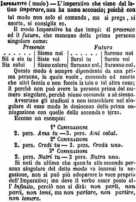 Imperativo (modo) - L'imperativo che viene dal latino imperare, non ha nome acconcio; poichè con tal modo non solo si comanda, ma si prega, si esorta, si consiglia ec.
