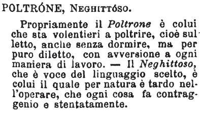 Poltrone, Neghittoso - Propriamente il Poltrone è colui che sta volentieri a poltrire, cioè sul letto, anche senza dormire, ma per puro diletto, con avversione a ogni maniera di lavoro. - Il Neghittoso, che è voce del linguaggio scelto, è colui il quale per natura è tardo nell'operare, che ogni cosa fa contraggenio e stentatamente. [immagine]
